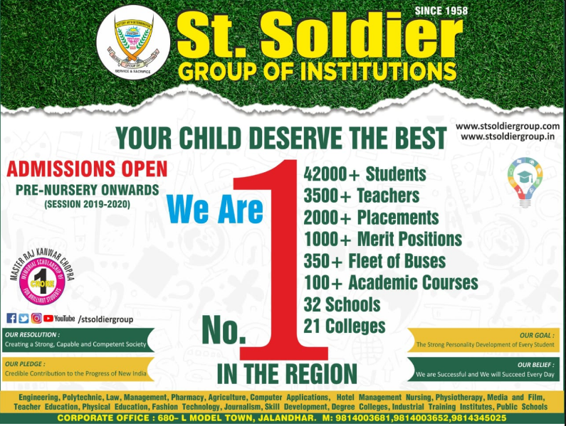 St. Soldier Divine Public School under the aegis of St. Soldier Educational Society offers Master Raj Kanwar Chopra Memorial Scholarships worth Rupees One Crore to deserving students. Every year more than 2000 students who are deprived members of society, meritorious students, Sports Achievers, Extra Curricular Activity achievers receive these scholarships for continuation of their studies.
